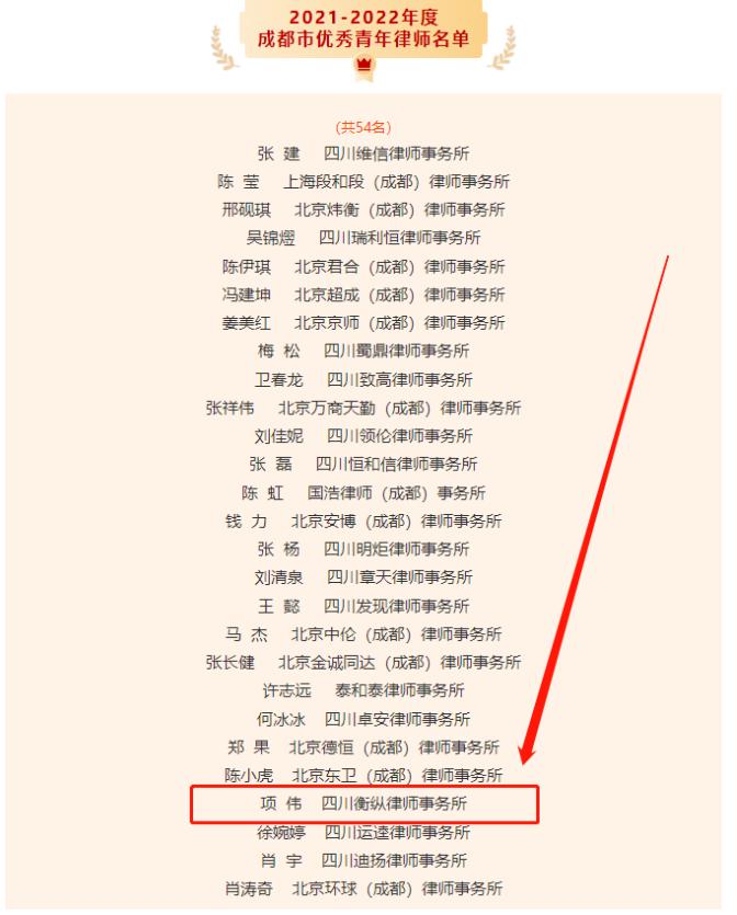 同期,成都市律师协会评选“2021-2022年度成都市优秀青年律师”,我所高级合伙人项伟律师成功获评。
