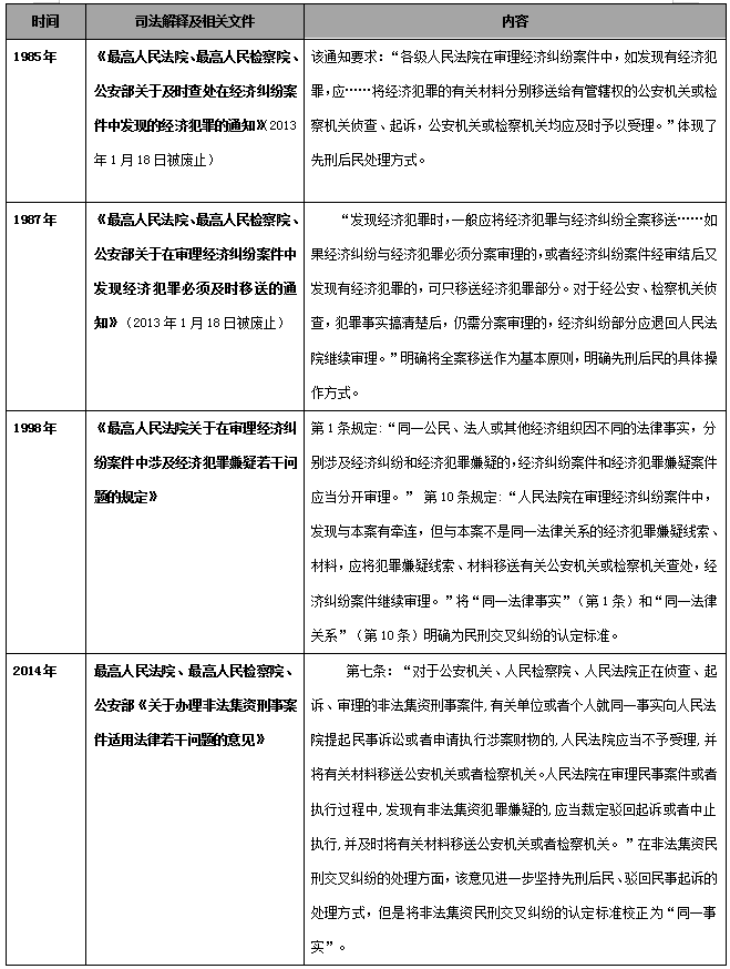 所谓刑民交叉案件,又称为刑民交织、刑民互涉案件,是指既涉及刑事法律关系,又涉及民事法律关系,且相互直接存在交叉、牵连、影响的案件。然而,我国的刑事法律制度、刑事诉讼法律制度、民事法律制度以及民事诉讼法律制度均没有规定民刑交叉纠纷的处理规则。仅在司法解释和司法政策层面明确了民刑交叉的标准以及在民刑交叉情况下先刑后民的处理方式。对此,笔者梳理了我国民刑交叉纠纷处理法律规则的发展历程,如下图所示: