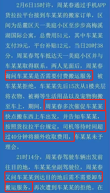 也就是说,货拉拉平台在这一单中提供的是居间撮合服务,从规则层面,具体承运人是被允许向平台用户提供付费搬运服务的。而且这一点也并不与日常生活经验相悖,司机实施的“询问是否需要付费搬运服务”以及“多次催促并告知超时将额外收费”这两个行为都不存在任何值得谴责的理由。同理,车某某拒绝司机提供付费搬运服务、在40分钟免费等待时间内不予理会司机的催促以及独自跟车,也都不存在错误。