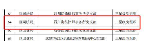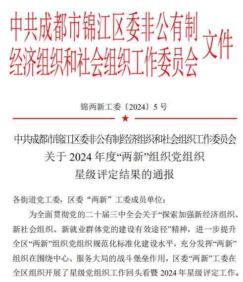 近日,中共成都市锦江区委非公有制经济组织和社会组织工作委员会对 2024 年度“两新”组织党组织星级评定结果进行了通报,衡纵党支部顺利晋升“三星级党组织”。