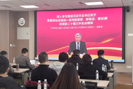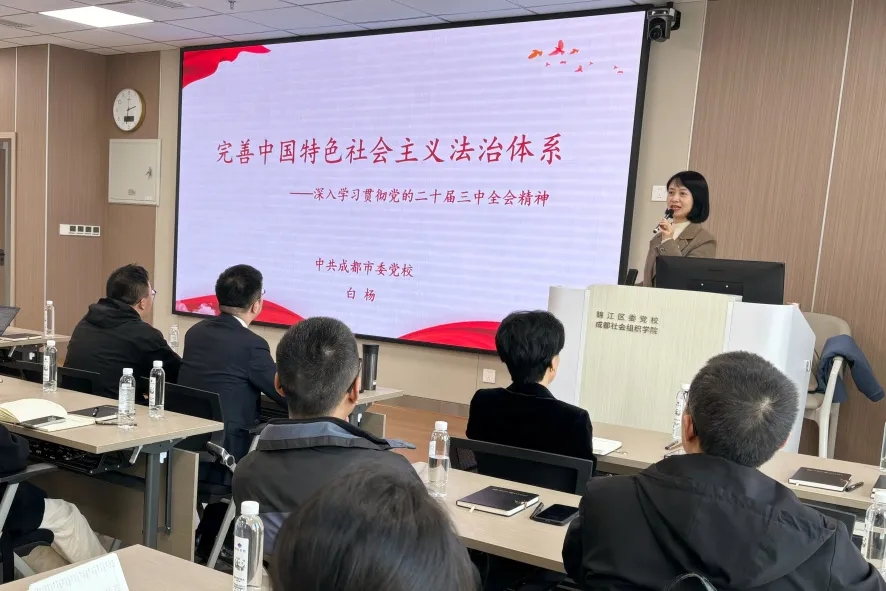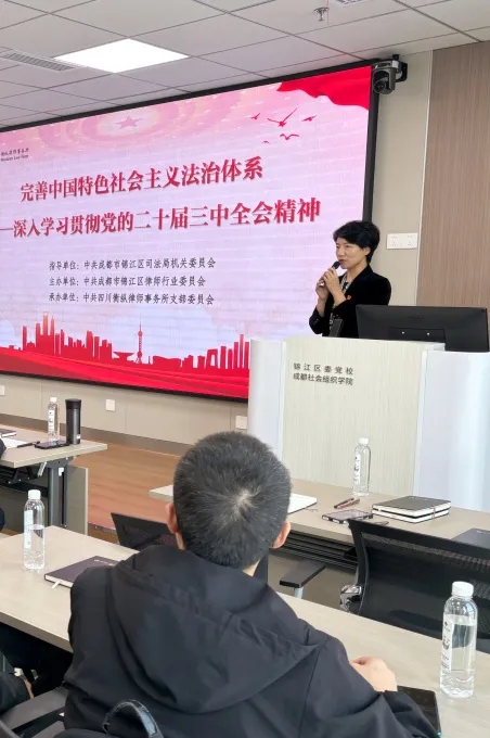 本次培训邀请了中共成都市委党校法学教研部主任、副教授白杨,以《完善中国特色社会主义法治体系——深入学习贯彻党的二十届三中全会精神》为题进行授课,围绕深刻认识全面深化改革和全面依法治国的辩证关系、准确把握完善中国特色社会主义法治体系的正确方向以及全面落实中国特色社会主义法治体系的重点任务三大方面,通过理论结合实例与大家进行了讨论交流。