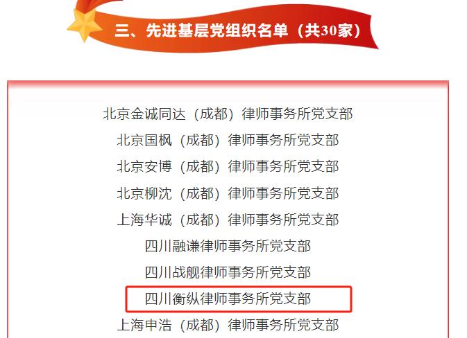 恰逢中国共产党成立104周年之际,成都市律师行业党委公布了优秀律师党员、优秀党务工作者、先进基层党组织等名单,并予以通报表扬,衡纵律师事务所党支部有幸获此殊荣。